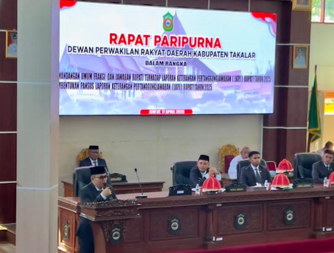 TAKALAR, INDIWARTA.COM – Rapat Paripurna DPRD Kabupaten Takalar dengan agenda penyampaian jawaban atas pandangan umum fraksi terhadap Laporan Keterangan Pertanggungjawaban (LKPJ) Bupati Tahun Anggaran 2025 berlangsung dinamis, Jumat, (17/04/2026). Delapan dari sembilan fraksi menyatakan persetujuan terhadap LKPJ tersebut, meski diwarnai sejumlah catatan kritis.