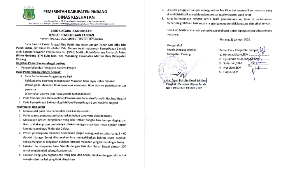 Berdasarkan Berita Acara Pemeriksaan nomor 400.7.11.1/02/DINKES-KESLING/TPP/2026, pemeriksaan yang berlokasi di Jl. Rutan, Pintu Gerbang BTN Bulu Mas tersebut mencakup uji fisik, kimia, hingga bakteriologi terhadap sampel makanan yang disajikan kepada siswa.