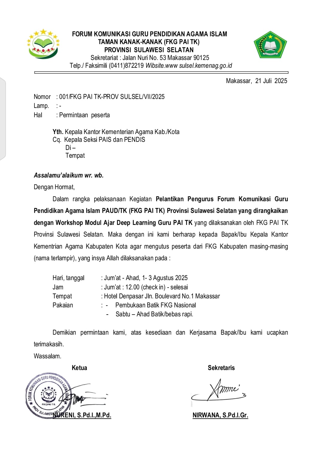 Kartini mempersilakan seluruh pertanyaan teknis terkait pelaksanaan workshop tersebut langsung dikonfirmasi ke pihak FKG PAI TK Sulsel sebagai penyelenggara.