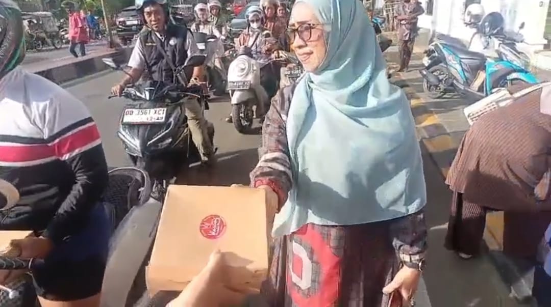 Sekitar pukul 16.10 Wita, Rusli tampak berdiri di sisi jalan sambil menyapa warga dan menyerahkan paket takjil secara langsung. Senyum dan ucapan terima kasih dari para pengendara mewarnai suasana sore itu.