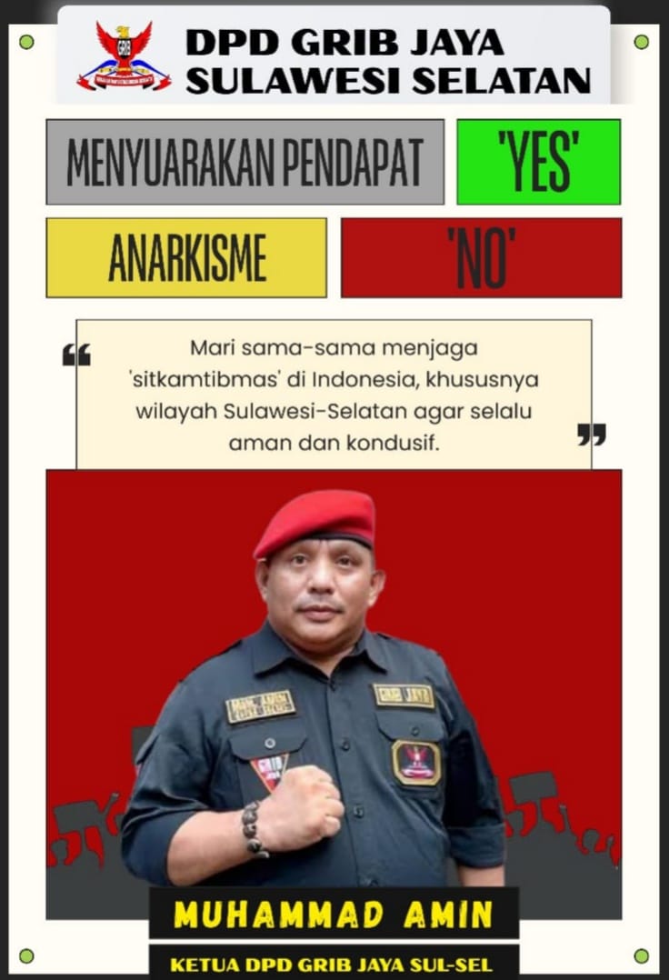 “Menyampaikan aspirasi, silahkan. Anarkis jangan. Secara pribadi dan selaku Ketua DPD GRIB JAYA Sulsel, anggota Grib Jaya, masyarakat, mahasiswa, agar jaga kedamaian dan keamanan serta ketenteraman Sulawesi Selatan, terkhusus Kota Makassar. Jangan mudah terprovokasi oleh oknum-oknum yang tidak dipercaya asal usulnya,” tegas Muhammad Amin.