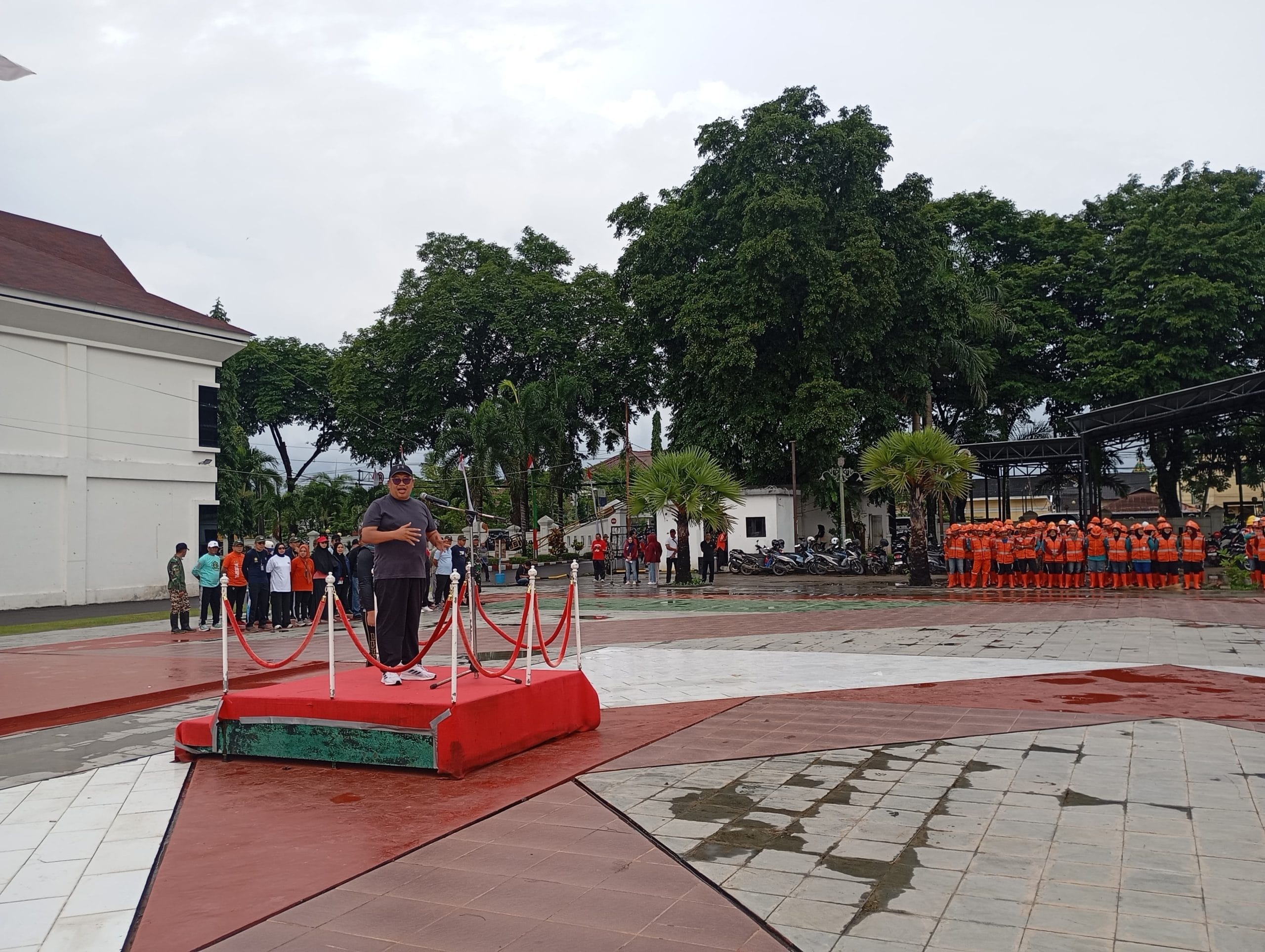 Mengenakan kaos abu-abu, celana training hitam, topi hitam, dan sepatu kets putih, Firdaus tampil sederhana sesuai konsep apel kebersihan yang dikemas dalam nuansa olahraga.