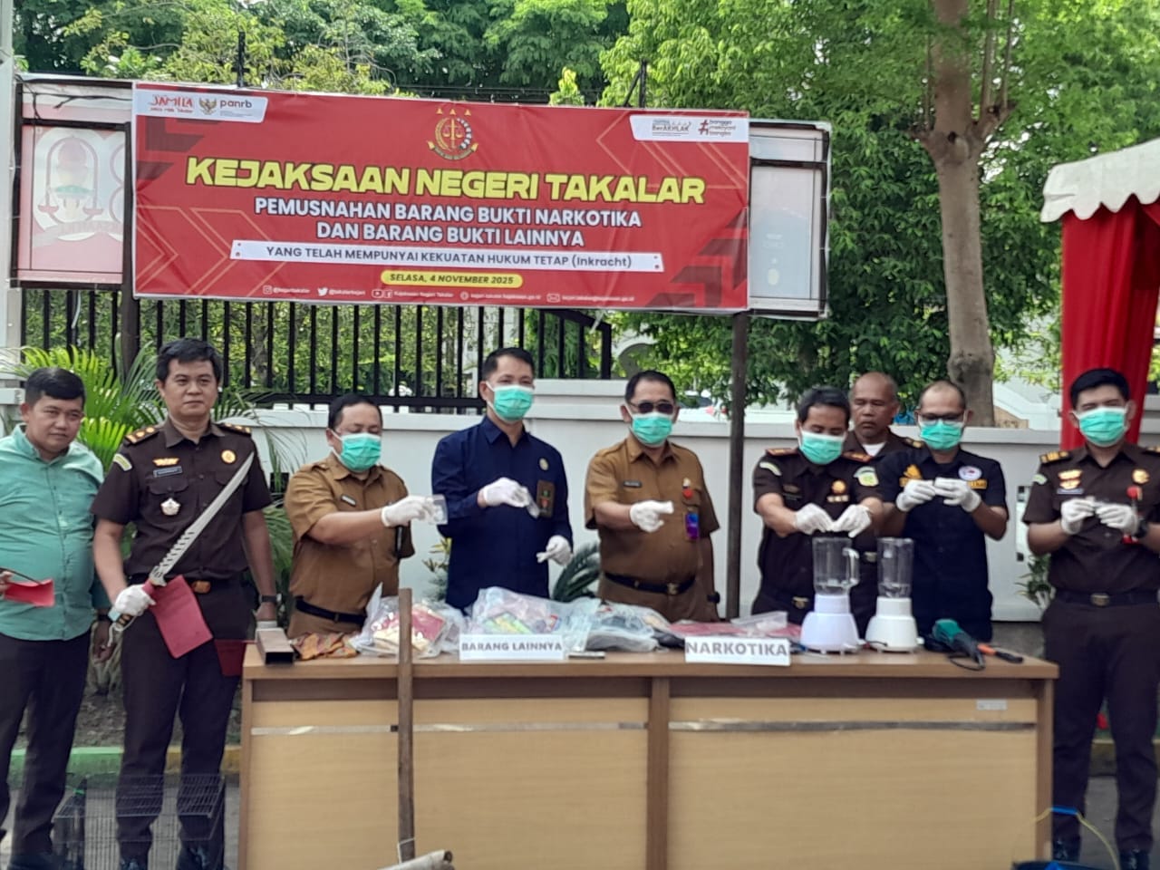 Kegiatan pemusnahan barang bukti itu dipimpin langsung oleh Kepala Kejaksaan Negeri Takalar, Muhammad Ahsan Thamrin, SH., MH., bersama jajaran. Turut hadir perwakilan Pemerintah Daerah Takalar, Ketua Pengadilan Negeri, dan Kanit Narkoba Polres Takalar. Acara ini diketuai oleh Kepala Seksi Pengelolaan Barang Bukti dan Barang Rampasan, Ahmad Imam Lahaya, SH., MH.