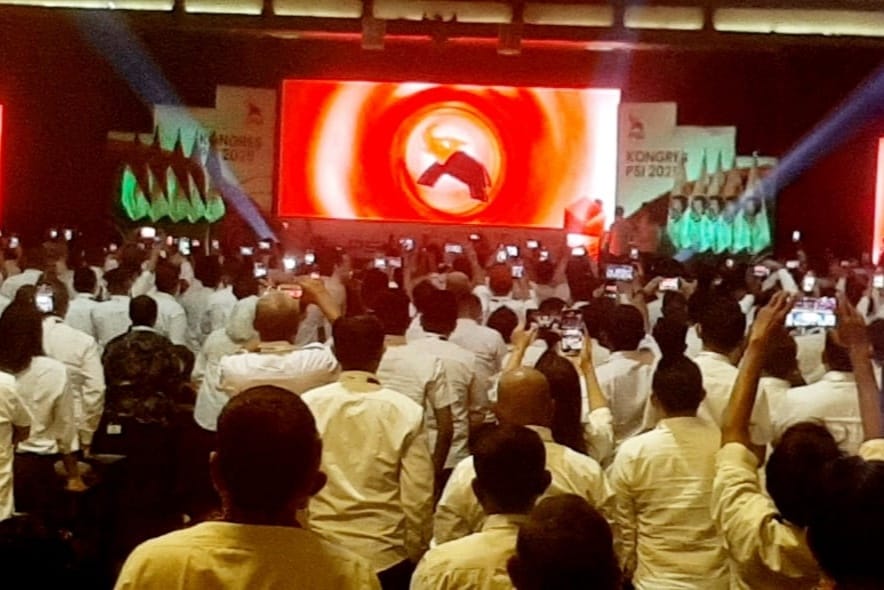 Gema suara gajah memenuhi Graha Saba Buana, sesaat setelah para kader Partai Solidaritas Indonesia (PSI) selesai menyanyikan lagu mars partai mereka di arena Kongres PSI.