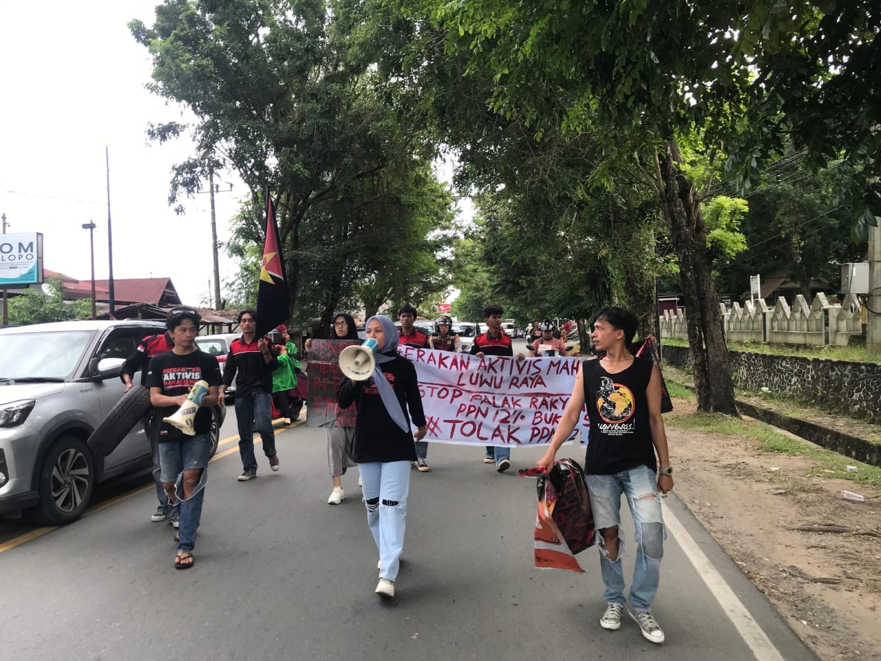 PALOPO, INDIWARTA.COM – Puluhan mahasiswa yang tergabung dalam Gerakan Aktivis Mahasiswa (GAM) Luwu Raya menggelar aksi unjuk rasa menolak kenaikan Pajak Pertambahan Nilai (PPN) menjadi 12%. Aksi berlangsung di depan Taman Makam Pahlawan Palopo, Jalan Ratulangi, Salobulo, Wara Utara, Kota Palopo, Senin (23/12/2024). Mereka menggelar long march dan membakar ban bekas sambil membentangkan spanduk bertuliskan “STOP PALAK RAKYAT” dan “PPN 12% BUKAN SOLUSI.”