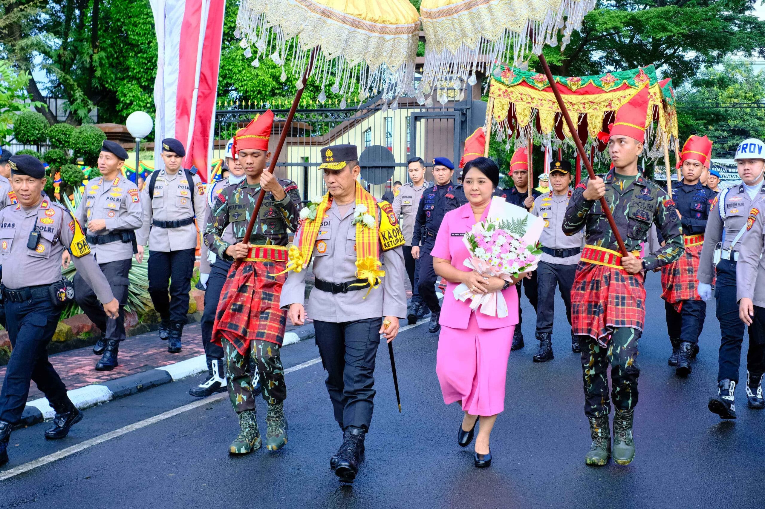 Kapolda Sulsel beserta istri kemudian menyapa jajaran personel yang berdiri berjejer menyambut kedatangannya dengan antusias.