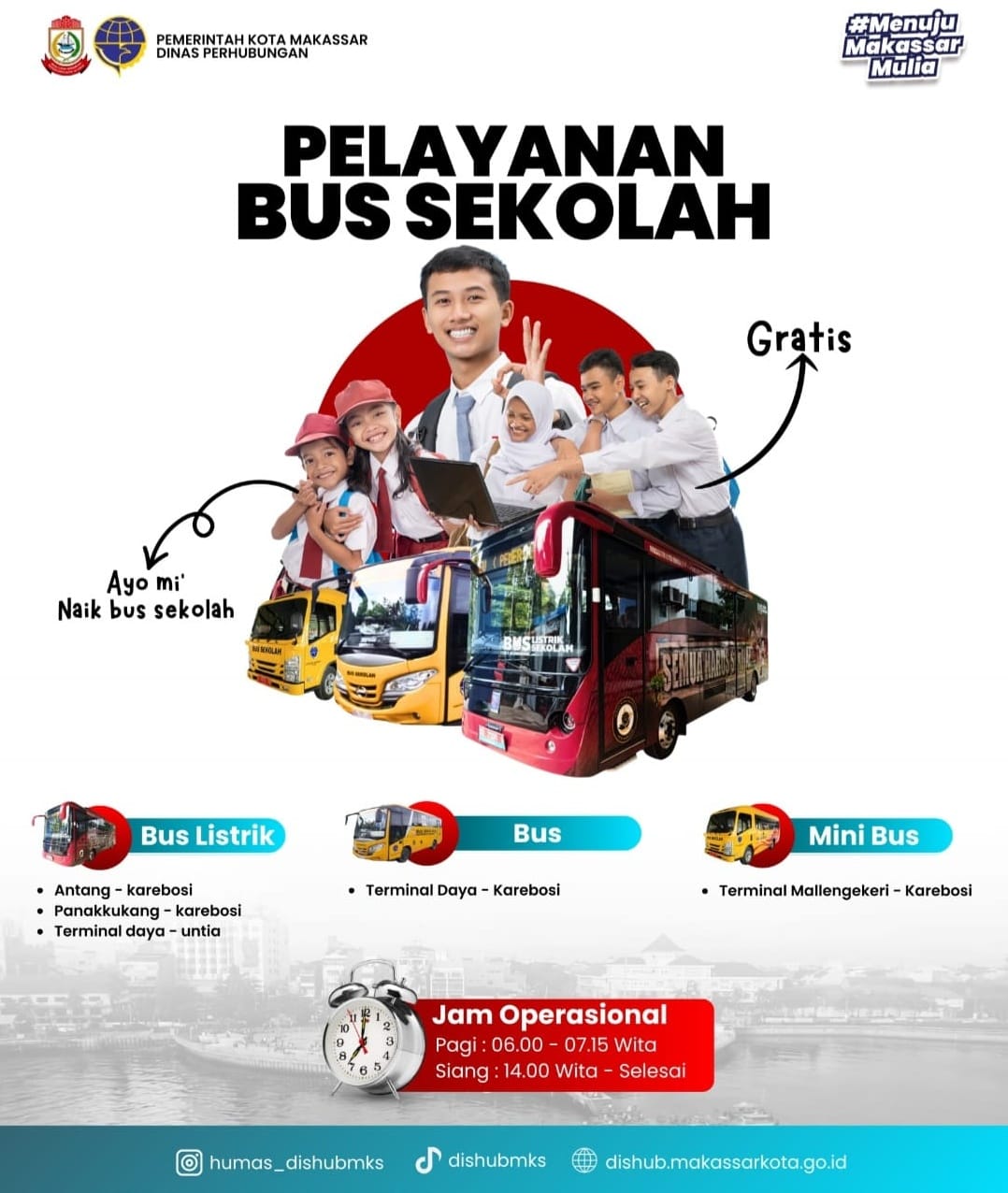 Terkait jadwal operasional dan titik naik bus sekolah, masyarakat dapat menghubungi Dinas Perhubungan Kota Makassar atau mengakses kanal resmi Pemkot Makassar.