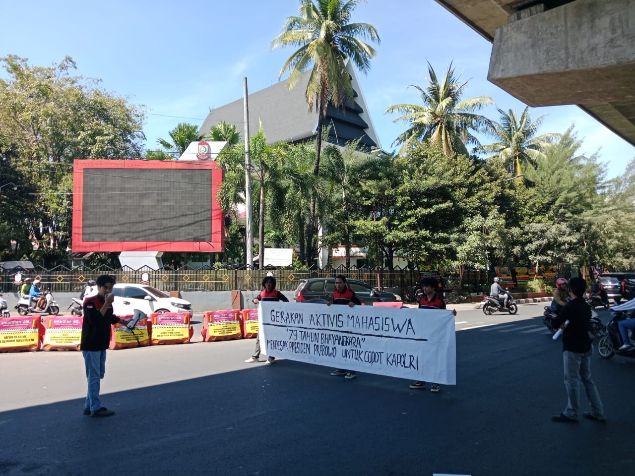 Dengan menggunakan mobil truk sebagai panggung orasi dan membakar ban bekas, massa aksi menyampaikan tuntutan mereka secara bergantian. Spanduk besar bertuliskan “79 TAHUN BHAYANGKARA, MENDESAK PRABOWO COPOT KAPOLRI” dibentangkan di tengah jalan, menarik perhatian publik.