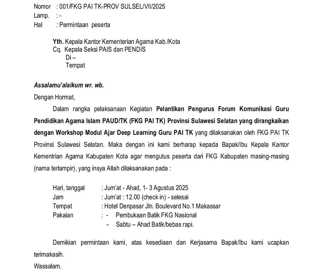 Data yang dihimpun menyebutkan, terdapat 40 guru asal Takalar yang terdaftar sebagai peserta Pelantikan Pengurus Forum Komunikasi Guru Pendidikan Agama Islam PAUD/TK (FKG PAI TK) Provinsi Sulsel yang dirangkaikan dengan Workshop Modul Ajar Deep Learning Guru PAI TK. Namun, hanya 22 guru yang benar-benar hadir di lokasi.