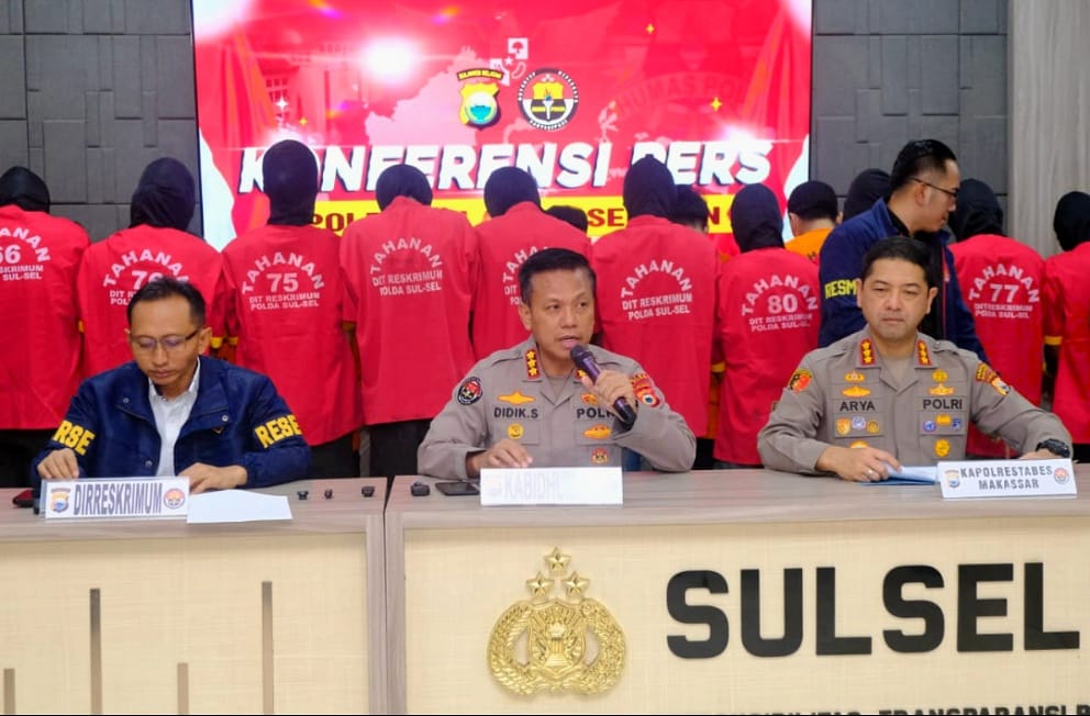 Konferensi pers dipimpin oleh Dirreskrimum Polda Sulsel Kombes Pol Setiadi Sulaksono, S.I.K., M.H., bersama Kabid Humas Polda Sulsel Kombes Pol Didik Supranoto, S.I.K., M.H., serta Kapolrestabes Makassar Kombes Pol Dr. Arya Perdana, S.H., S.I.K., M.Si.