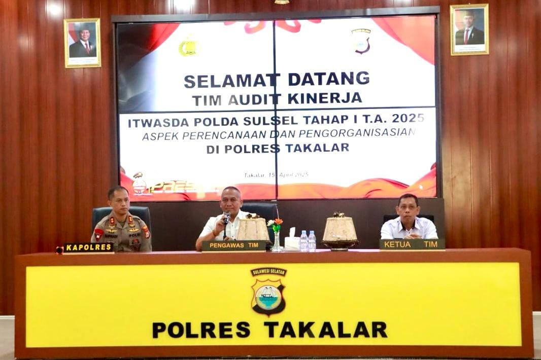 TAKALAR, INDIWARTA.COM – Polres Takalar menerima kunjungan Tim Audit Kinerja dari Inspektorat Pengawasan Daerah (Itwasda) Polda Sulawesi Selatan dalam rangka pelaksanaan Audit Kinerja Tahap I Tahun 2025. Audit ini difokuskan pada aspek perencanaan dan pengorganisasian, dan berlangsung di Aula Wicaksana Laghawa, Mapolres Takalar, Selasa pagi pukul 09.00 WITA.