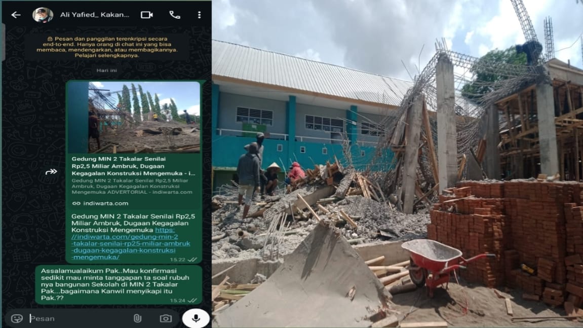 TAKALAR, INDIWARTA.COM – Robohnya bangunan proyek gedung Madrasah Ibtidaiyah Negeri (MIN) 2 Takalar di Desa Banggae, Kecamatan Mangarabombang, menyisakan tanda tanya besar. Insiden yang terjadi pada Selasa, 4 November 2025 sekitar pukul 17.00 WITA itu memunculkan dugaan kegagalan konstruksi, mengingat bangunan belum rampung namun sudah tak mampu menopang struktur sendiri.
