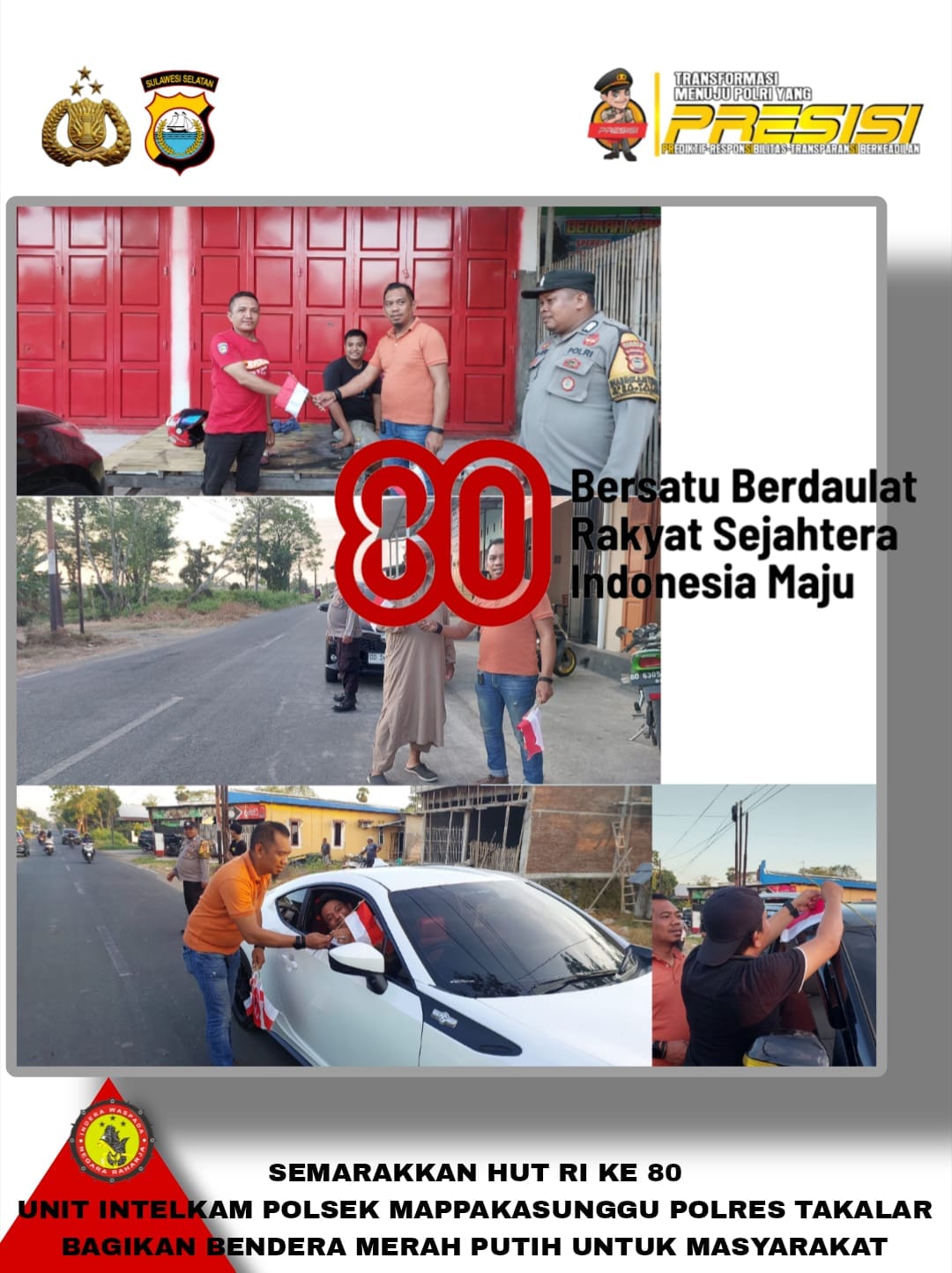 TAKALAR, INDIWARTA.COM – Menyambut Hari Ulang Tahun ke-80 Republik Indonesia, Unit Intelkam Polsek Mappakasunggu (Mapsu), Polres Takalar, menggelar aksi simpatik dengan membagikan bendera merah putih mini kepada pengguna jalan di poros Jalan Kecamatan Mapsu, Kabupaten Takalar, Sulawesi Selatan, Selasa (5/8/2025).
