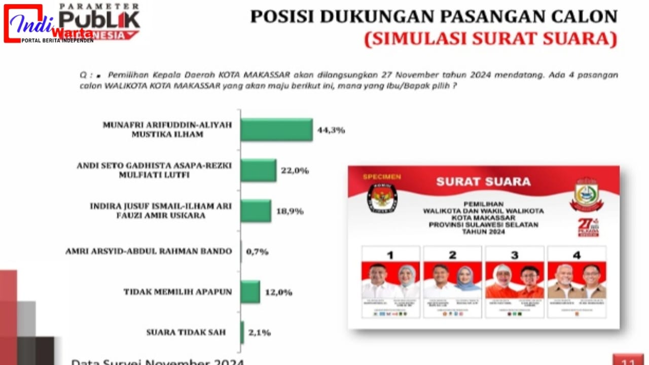 Lembaga PPI, yang merupakan anggota Perkumpulan Survei Opini Publik Indonesia (Persepi), memotret dinamika elektoral dari empat paslon: MULIA, Andi Seto Asapa-Rezki Mulfiati Lutfi (SEHATI), Indira Jusuf Ismail-Ilham Ari Fauzi (INIMI), dan Amri Arsyid-Rahman Bando (AMAN). Survei dilakukan pada 15–20 November 2024 dengan melibatkan 440 responden dari 15 kecamatan di Makassar.